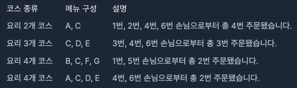 - 만약 가장 많이 함께 주문된 메뉴 구성이 여러 개라면, 모두 배열에 담아 return 하면 됩니다.