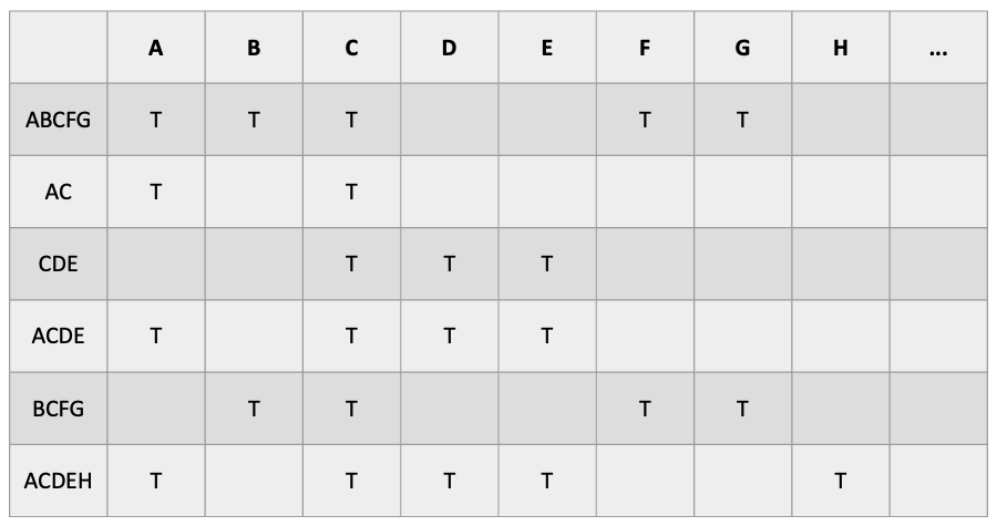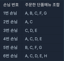예를 들어, 손님 6명이 주문한 단품메뉴들의 조합이 다음과 같다면,