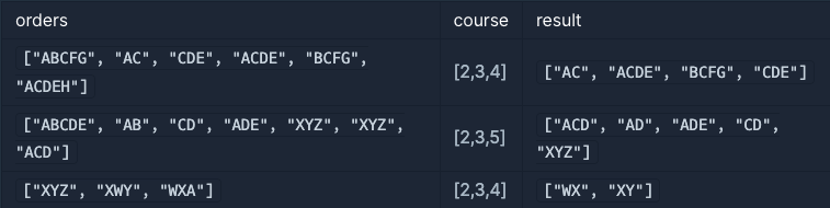 - orders와 course 매개변수는 return 하는 배열의 길이가 1 이상이 되도록 주어집니다.