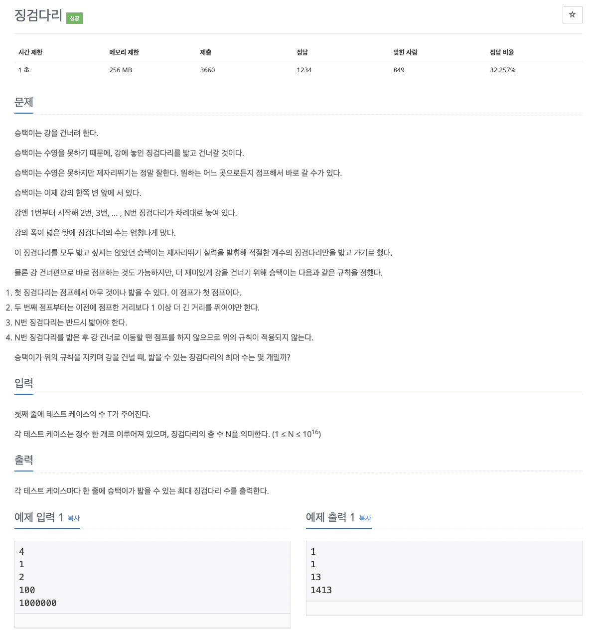 그렇다면, 몇 개의 징검다리를 건넜을 때가 최대 징검다리가 될 까? 이 징검다리 수를 m으로 두고 이분탐색을 통해 조건을 만족하는 최대 m 값을 구하면 된다.