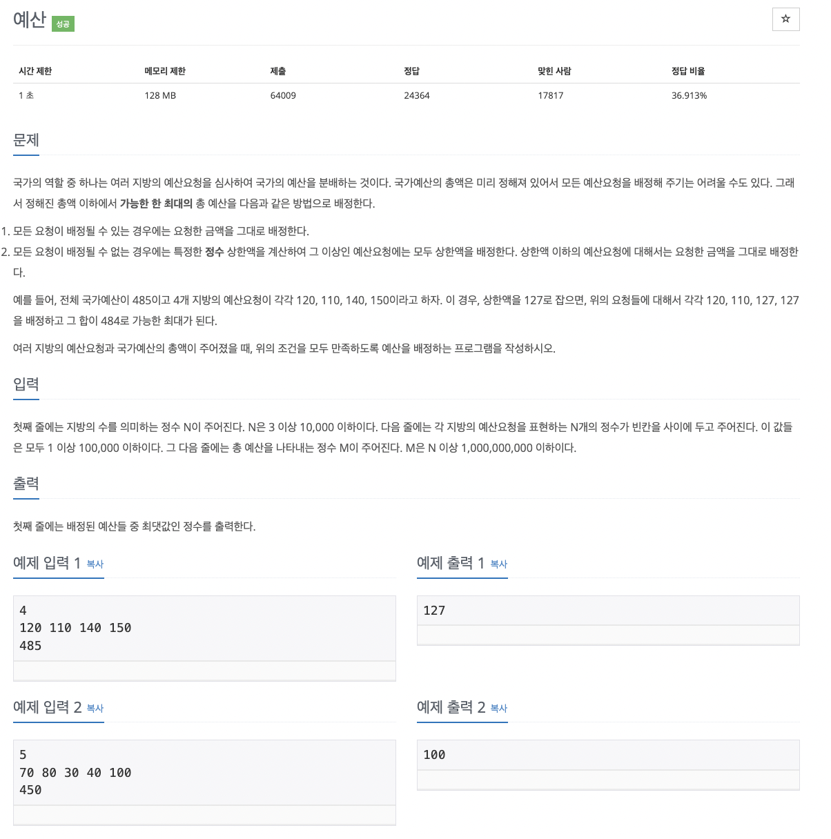 이 문제의 경우 예산액의 범위가 1 이상 100,000 이하여서 굳이 이분탐색이진 않아도 될 거 같긴 하다만, 이분탐색으로 풀었음.
