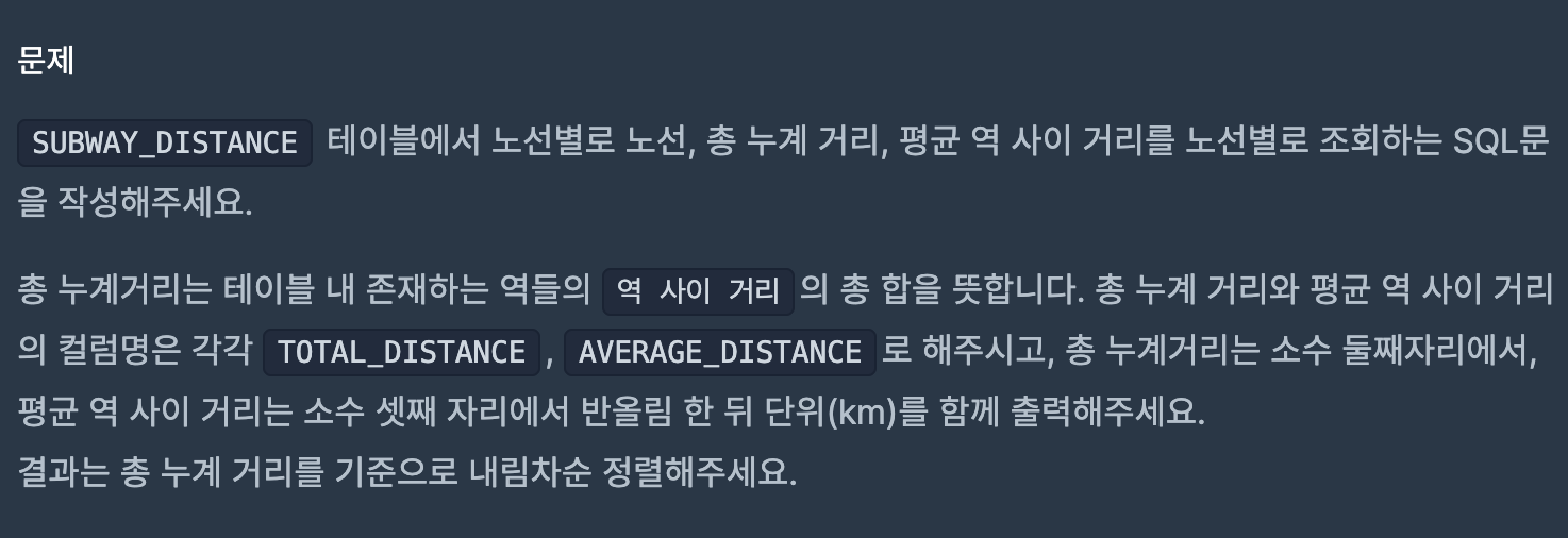 -- 총 누계거리는 소수 둘째자리, 평균 역 사이 거리는 소수 셋째 자리 반올림, 단위(km)를 함께 출력