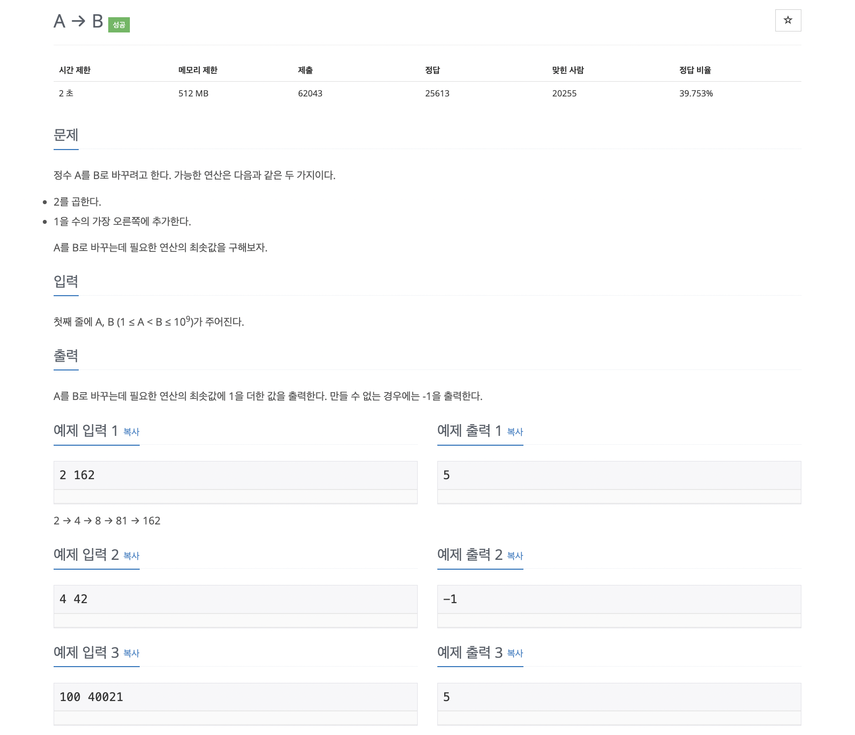 즉, B -> A로 가면서 1이 있으면 1을 제외하고, 1이 없으면 2를 나누고, 두 연산 다 되지 않거나 B의 연산값이 A보다 작아지면 -1을 출력한다.