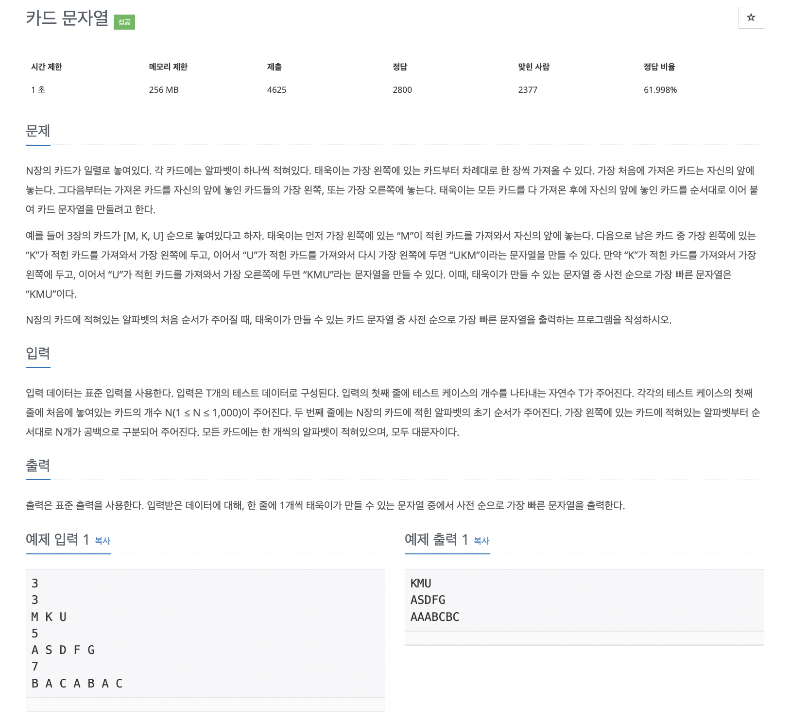 카드를 순서대로 하나씩 가져오면서 사전 순으로 가장 빠르게 정렬하는 것. 이때 가장 왼쪽 또는 가장 오른쪽에만 둘 수 있다.