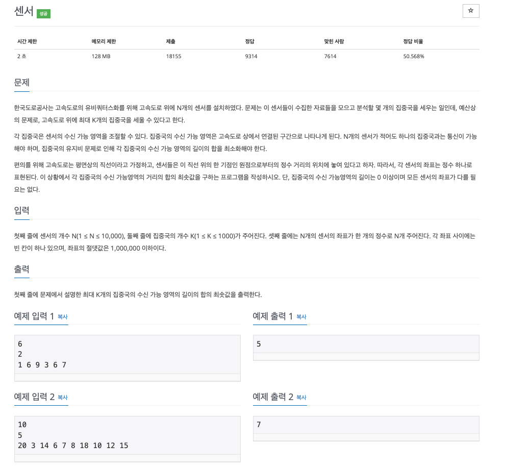 3. 이 센서 사이의 거리를 정렬해서 가장 거리가 먼 경우를 k-1 개 제외한 거리의 값을 더하면 최솟값이다.