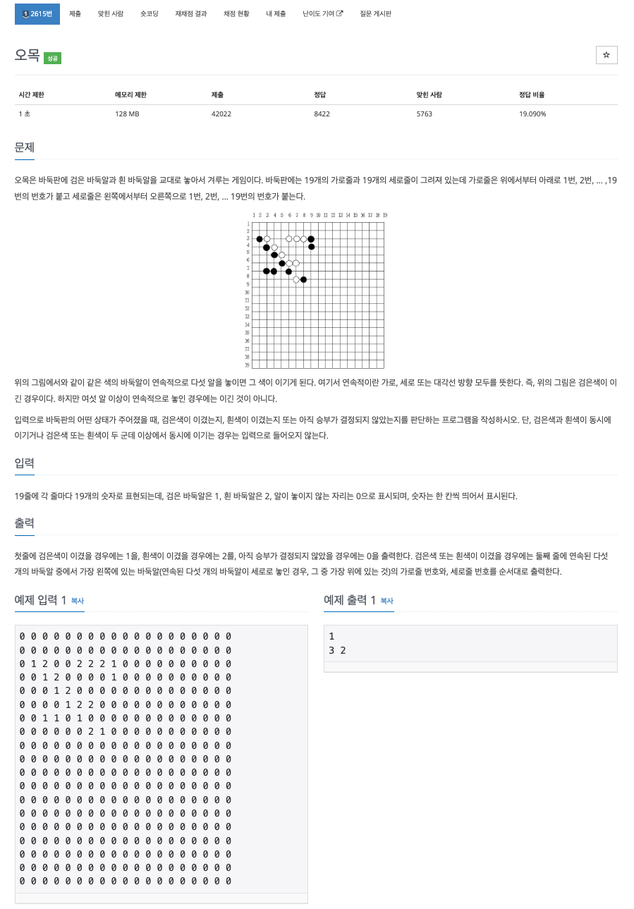 다른 시작좌표에서 해당 좌표를 포함해 5목인 경우를 찾을 수 없었고,