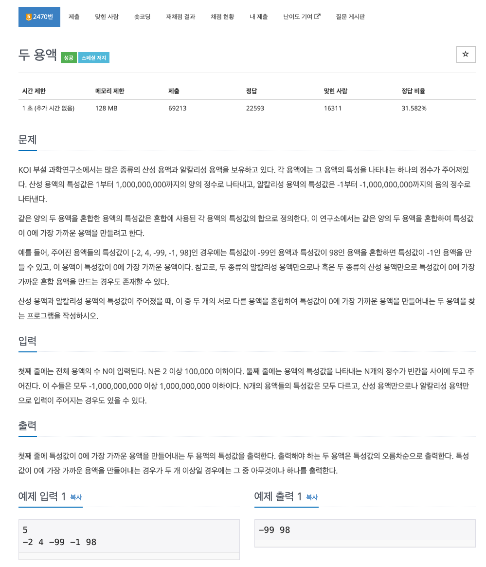 2. 두 용액의 합이 음수일 때는 s++;, 양수일 때는 e--;로 범위 좁히기